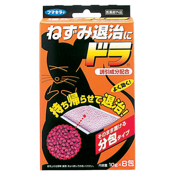 ネズミの習性である貯食性を利用した駆除剤で、ネズミが袋ごとラクに