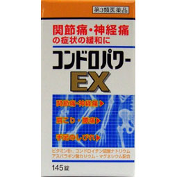 コンドロパワーEX錠は神経系の調節機能があるビタミンB1に、コンドロイチン硫酸エステルナトリウムとビタミンB1の作用を助けるアスパラギン酸カリウム・マグネシウム、さらに塩酸グルコサミン(緩衝剤)を配合した関節痛や神経痛に効果がある製品です。